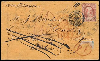 1852, 3¢ dull red, type II. Tied by Albany, N.Y. cds on 1853 cover addressed to Cadiz, Spain and sent to a London forwarder, the 3¢ is cancelled by red "19" credit handstamp & tied by French transit, a small portion of 1851 1¢ blue is visible at lower, which has been torn off in transit and tied by oval "PF" handstamp, London forwarder crossed out and sent on to Cadiz, Very Fine, a fascinating cover. Scott No. 11A; Estimate $300 - 400. US$300-400 (Image)