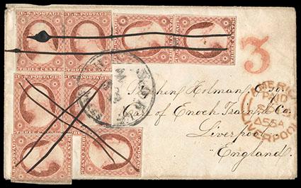 1852, 3¢ dull red, type II. Eight singles, large margins to just in, cancelled or tied by penstrokes and Holyoke Mass. cds on 1855 cover to Liverpool, England, red "3" credit handstamp, Liverpool receiving cds (Sep. 15, 1855), two stamps with small flaws including one from placement at edge of cover, Fine, an unusual franking to pay the 24¢ rate. Scott No. 11A; Estimate $300 - 400. US$300-400 (Image)