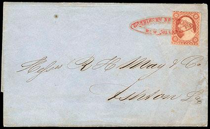 1852, 3¢ dull red, type II. Cut in at top, tied by large red oval company handstamp of Gorrissen Brothers, New Orleans on 1855 folded letter to Ashton, La., Very Fine, quite unusual tied by this company handstamp. Scott No. 11A; Estimate $200 - 300. US$200-300 (Image)