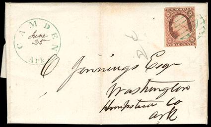 1852, 3¢ dull red, type II. Tied by green grid cancel on 1853 folded cover with matching green "Camden, Ark." cds, addressed to Washington, Ark.; cover with vertical file fold, Very Fine. Scott No. 11A; Estimate $100 - 150. US$100-150 (Image)