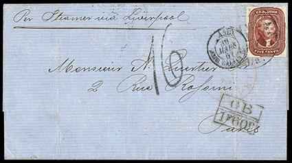 1856, 5¢ red brown. Rich color and four attractive margins, tied on 1857 folded cover to France by New Orleans cds and black French double circle entry handstamp, boxed "G.B. 1F60C" accountancy handstamp, large "16" decimes, manuscript notation "Per Steamer via Liverpool", backstamped red G.B. crown circle transit and Paris receiver, Extremely Fine, a lovely cover in choice condition, signed Ashbrook, with 1994 P.F. & 1993 Rendon certificates. Scott No. 12; Estimate $500 - 750. US$500-750 (Image)