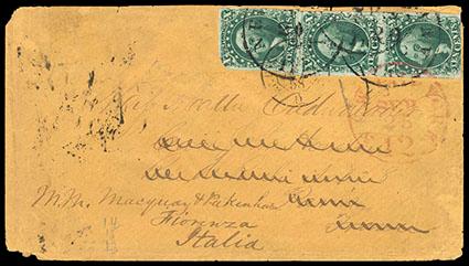 1855, 10¢ green, types II, III & I. Vert. strip of 3, nice margins to just in, corner clipped at top left, tied by town cancels on 1858 cover to France and forwarded to Italy, cover with corner wear, Fine, a rare cover with the type I-III combination strip. Scott No. 13,14,15; Estimate $500 - 750. US$500-750 (Image)