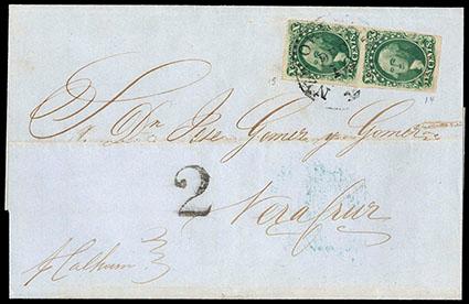 1855, 10¢ green, types II & III. Vertical combination pair, Positions 27-37L1, large margins to just clear at lower right, strong color, tied by "New Orleans La., Dec 10" cds on light blue folded cover to Vera Cruz, Mexico, endorsed "p Calhoun" at lower left, blue "Puig & Avendano, New Orleans" oval flap seal handstamp, Mexican bold "2" reales inland postage due handstamp; light file fold with few tiny erosion spots, Very Fine, with 2005 P.F. certificate. Scott No. 14, 15; Estimate $400 - 600. US$400-600 (Image)