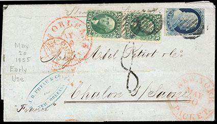 1855, 10¢ green, types II & III. Vertical pair tied in combination with 1851 1¢ blue type IV on 1855 folded cover to France by red "New Orleans May 20" cds, numerous transit & arrival markings, stamp with margins to cut in, Fine, a very early usage of the 10¢ imperf paying the British Open Mail rate, this being the second known date of the 10¢ type III. Scott No. 14,15; Estimate $300 - 400. US$300-400 (Image)