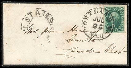 1855, 10¢ green, type II. Position 54R1, large margins, deep rich color, tied by "Portland Me., Paid, Jul 25" cds on mourning cover to Toronto, Canada, black "U.States" arched exchange handstamp, Jul. 23rd arrival backstamp, Very Fine. Scott No. 14; Estimate $200 - 300. US$200-300 (Image)