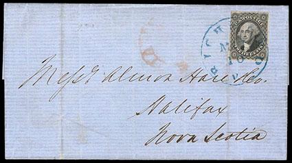 1851, 12¢ gray black. Margins large to just in at upper left, tied by blue "Richmond, Va., May 10" cds on folded letter sheet to Halifax, Nova Scotia, red arched "U. States" handstamp, with New Brunswick transit and H., N.S., May 20, 1854 receiving backstamps, Very Fine, one of four known 12¢ imperforate usages to Nova Scotia overpaying the 10¢ rate, with sender apparently believing an added 2¢ payment was necessary for paying the outbound ship fee. Scott No. 17; Estimate $750 - 1,000. US$750-1,000 (Image)