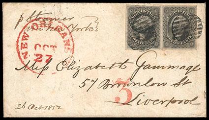 1851, 12¢ gray black, horizontal pair. Four large margins except close at top left, tied by three strikes of circular grid cancel, red "New Orleans La., Oct 27" cds on 1852 cover to Liverpool, England, New York red "3" cent credit handstamp, carried by Ocean Line Washington from New York Nov. 6th to Southampton arriving Nov. 21st, green Liverpool (11.22) arrival backstamp; slight allover soiling, a Very Fine American Packet use. Scott No. 17; Estimate $300 - 400. US$300-400 (Image)