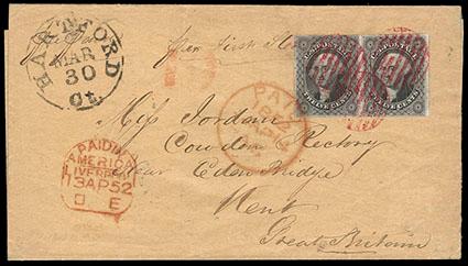 1851, 12¢ gray black, horizontal pair. Margins large to touching frameline, tied by red circular grid handstamps on 1852 folded letter sheet to Edenbridge, England, "Hartford, Ct., Mar 30" origin cds and red "19" credit handstamp, red Liverpool entry and London transit date stamp additionally tying pair, receiving postmark on reverse; cover missing right sideflap, Very Fine. Scott No. 17; Estimate $200 - 300. US$200-300 (Image)