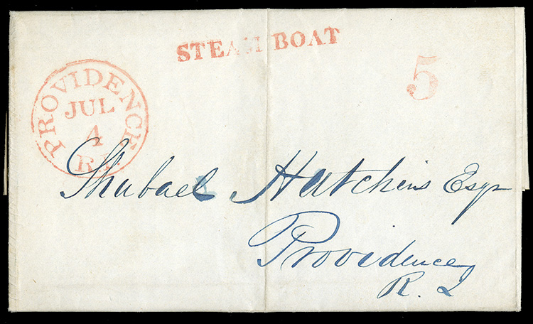 United States Stampless covers Rhode Island 1846 (4 July) FL, bill of lading from Dunham & Dimon Shipping and Commission Merchants in New York, with red Providence R.I. arrival cds, also "STEAMBOAT" and "5" rate hs, usual filing fold, fine (Image)