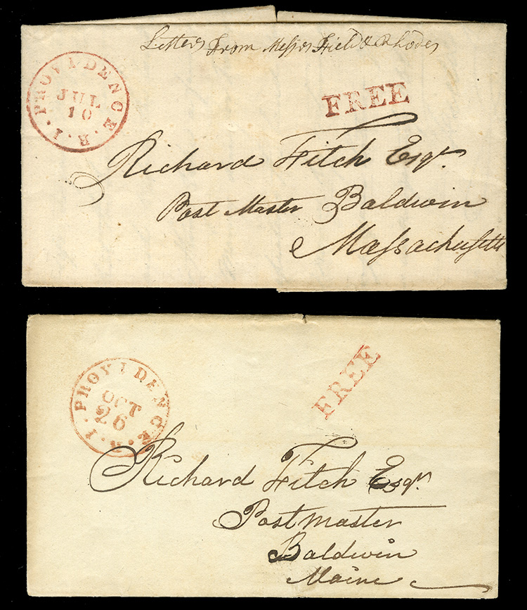 United States Stampless covers Rhode Island 1815-20 two FLs from Messrs. Fields & Rhodes, one addressed to Richard Fitch, Postmaster Baldwin, Mass., the other to the Postmaster of Baldwin, Maine, each with red "FREE" and Providence R.I. July 10 (1815) and Oct 26 (1820) departure pmks, alongside, fine (Image)