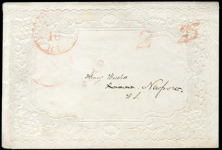 United States Stampless covers Rhode Island 1820 (ca) Providence R.I. Feb. 16, red cds with "2" handstamped twice for local rate, forwarded to Newport with additional red "5" rate hs, all applied on embossed Valentine cover, v.f. (Image)
