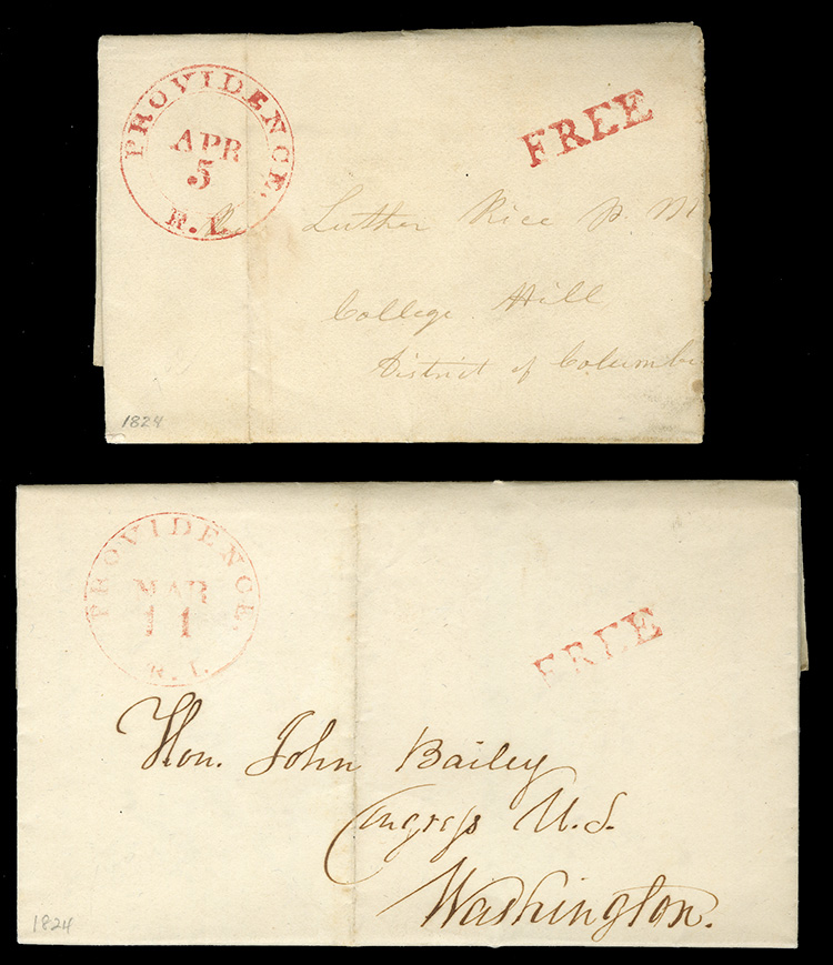 United States Stampless covers Rhode Island 1824 two FLs from Providence to D.C., each with a different departure pmk, handstamped "FREE" alongside, one sent by Nick Brown, Jr (Mar 11) to John Bailey, Congress U.S., the other by Rev. Isaac McCoy to Luther Rice, P.M. College Hill, District of Columbia, fine (Nick Brown was the son of Nicholas Brown Sr., a merchant and co-founder of Brown University) (Image)