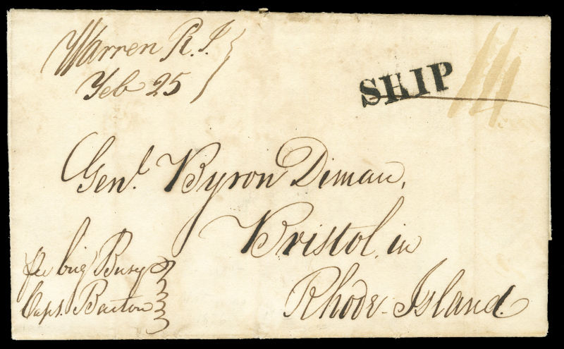 United States Stampless covers Rhode Island 1826 (6 Feb) FL datelined "Matanzas", handstamped "SHIP" and addressed to General Byron Diman in Bristol, Rhode Island, ship's endorsement and Captain's endorsements at bottom left, ms rate mark at upper right, fine incoming usage from Matanzas (Cuba) (Byron Diman was in whaling and mill businesses, served in the Rhode Island Militia and later became Brigadier General. He later became governor of Rhode Island, elected as Law and Order Party candidate) (Image)