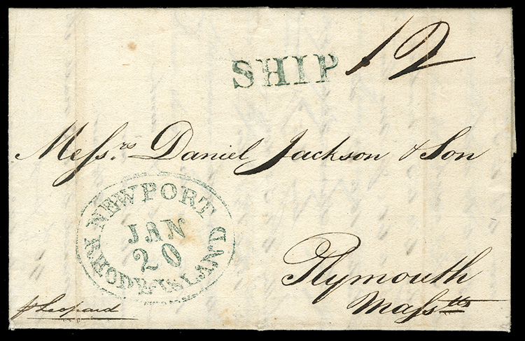 United States Stampless covers Rhode Island 1826 (31 Oct) FL sent from Buenos Aires to Plymouth, Mass, with green "SHIP" and large oval "Newport, Rhode Island Jan 20" arrival datestamp, "12" ms rate mark at upper right, endorsed "P. Leopard" at bottom, fine (Image)