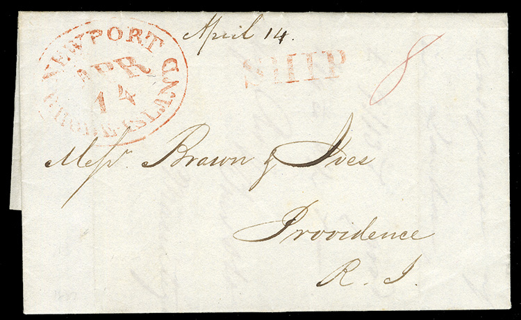 United States Stampless covers Rhode Island 1827 (15 Mar) FL sent from Havana to Providence, R.I, with red "SHIP" and large oval "Newport, Rhode Island Apr 14" arrival datestamp, "8" ms rate mark (Image)