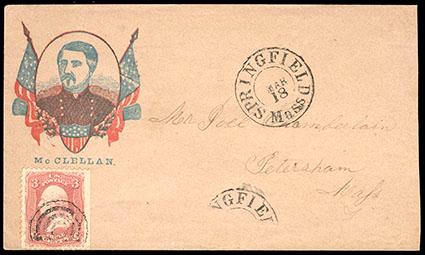 Patriotic Cover Balance. Group of 38 covers with seven unused; wide range of common to scarce designs includes couple Jeff & Davis dogs caricatures, McClellan portraits, allover Kentucky - Loyal to the Union, Game Cock of Uncle Sam, Lincoln campaign (faulty), etc., three non-contemporary usages including Magnus design from Newfoundland, unused including multicolored Rose of Washington Magnus cover; condition varies, inspect. Estimate; $1,500 - 2,000.
