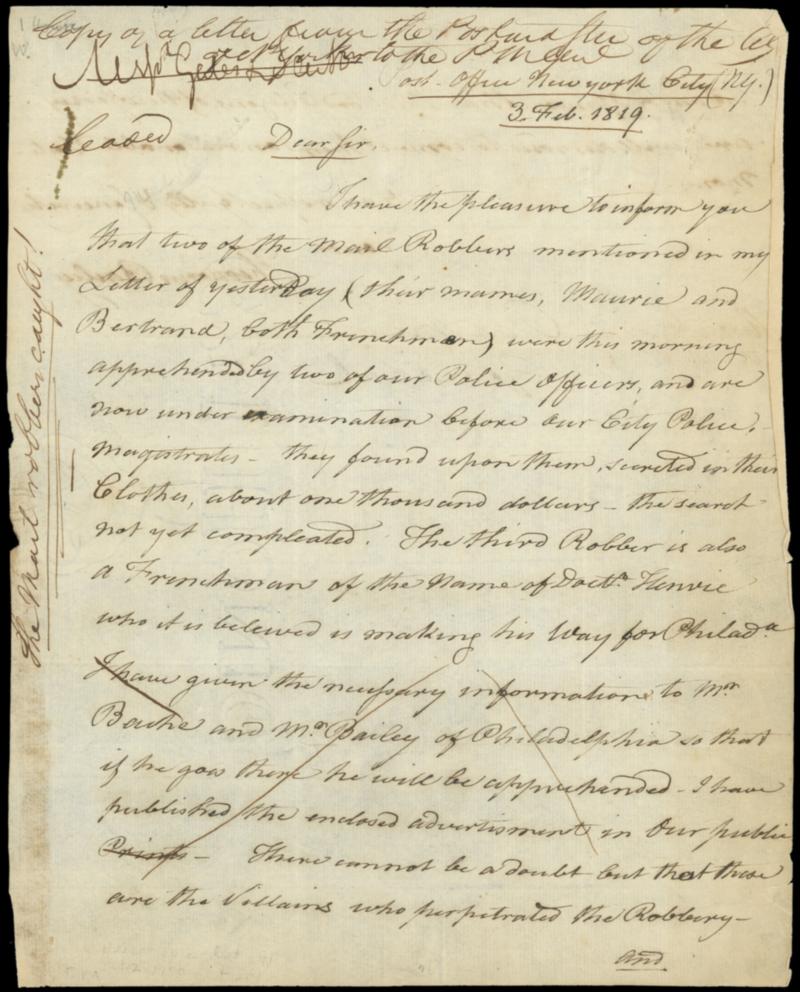 1819 (Feb. 2) Post Office New York City "The Mail Robbers Caught!" . Original Theodorus Vail, Postmaster N.Y. letter to Postmaster General R.J. Meigs that was edited and published in part titled "The Mail Robbers Caught!" along the side reading "Post Office New York City (N.Y.), 3 Feb. 1819, Dear Sir, I have the pleasure to inform you that two of the mail Robbers mentioned in my Letter of yesterday (their names, Maurie and Bertrand, both Frenchmen) were this morning apprehended by two of our Police Officers, and are now under examination before our City Police Magistrates. They found upon them, secreted in their clothes, about one thousand dollars - the search not yet completed. The third Robber is also a Frenchman of the name of Doctr. Henrie who it is believed is making his way for Philada. [the following parts of the letter except signature are crossed out for the publication] I have given the necessary information to Mr. Bache and Mr.Bailey of Philadelphia so that if he goes there 4e will be apprehended. I have published the enclosed advertisment in our public prints. There cannot be a doubt but that these are the villains who perpetrated the Robbery and I am of opinion that the Good Citizens of New Jersey are well disposed to convict them on reasonable testimony. (in another hand) Very respectfully & sincerely Yours, Theodorus Bailey"; small edge flaws, Fine and early mail robbery documentation. Estimate; $300 - 400. US$300-400 (Image)