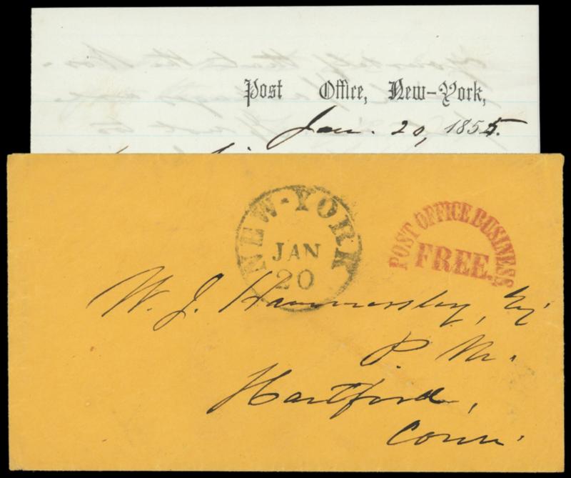 1855 (Jan. 11-20) James Holbrock Mail Loss Letters. Group of three letters from Holbrock sent from New York City to the Postmaster at Hartford Conn., each on official letterhead and enclosed in orange envelopes with New York postmarks and red "Post Office Business, Free" arc rating handstamps, they discuss mail losses between Willimanic Conn. and New York City and include his suspicion that the robberies could be localized to between Hartford and Norwich, the first letter discusses his book "Ten Years Among the Mail Bags or Notes from the Diary of a Special Agent of the Post Office Department" and thanks the postmaster for help in the facts of one of the previous cases to be described in his book, Very Fine trio. Estimate; $300 - 400. View a PDF of images for this lot US$300-400 (Image)