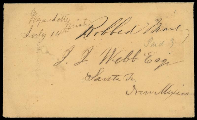 (Robbery) 1855 (Jul. 14) Wyandotte, Mich. to Sante Fe N.M. (Robbed Mail). Buff cover with manuscript "Wyandotte, Mich. July 14" postmark on Webb correspondence cover to Sante Fe, New Mexico on the Hall contract route, mail was robbed enroute from St. Louis to Sante Fe on the Hall contract route, original letter datelined "Wyandotte July 14, 55", manuscript "Robbed Mail" across top by Jefferson City Mo. postmaster and pencil "Paid 3" below; erosion hole and small edge tear, Fine and rare. Estimate; $2,000 - 3,000.