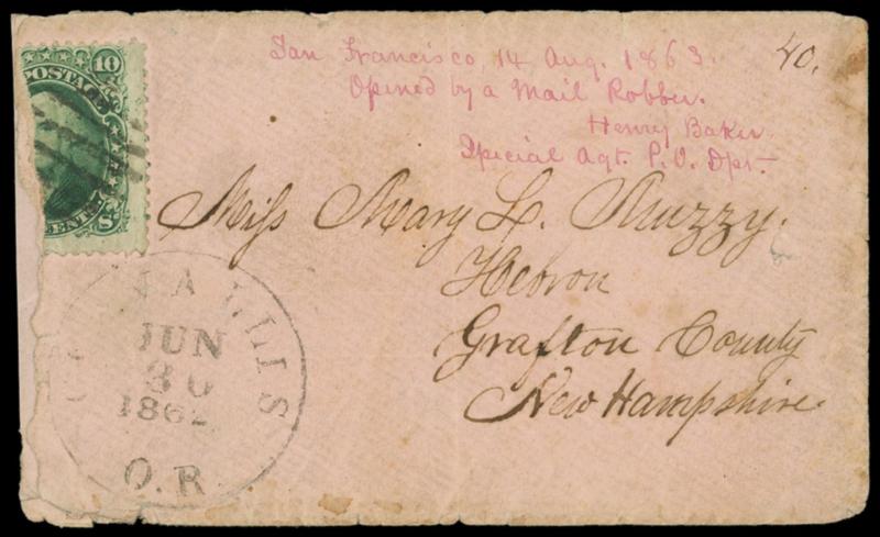 (Robbery) 1863 (Jun. 30) Corvallis, Oregon to Hebron, N.H. Pink envelope bearing 10¢ green (35) canceled by open grid cancel and just tied by rim of "Corvallis Or., Jun 30, 1862" cds, robbed enroute from Oregon to San Francisco, magenta "San Francisco, 14 Aug. 1863, Opened by Mail Robber. Henry Baker Special Agt. P.O. Dpt." notation; robber roughly opened and reduced at left tearing away half of stamp, edge wear, Fine. Estimate; $1,000 - 1,500.