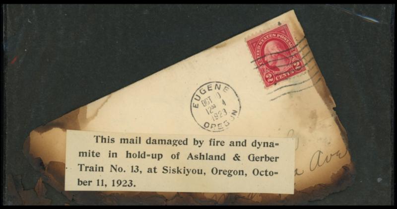 (Robbery) 1923 Ashland & Gerber Train No. 13 Mail Robbery Cover. Original fire damaged cover bearing 2¢ Wash. tied by "Eugene, Oregon, Oct 10, 1923" machine cancel to Glendale Cal., house in pouch with trimmed "This mail damaged by fire and dynamite hold-up of Ashland & Gerber Train No. 13, at Siskiyou, Oregon, October 11, 1923." printed label; entered mails with Post Office Dept. penalty ambulance envelope canceled by "San Francisco, Calif. 1923" machine cancel to Glendale, edge nick; accompanied by original Wanted Broadside for the Autremont Brothers and describing the robbery that was widely circulated by mail, Very Fine group. Estimate; $500 - 750. View a PDF of images for this lot US$500-750 (Image)