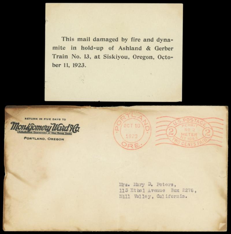 (Robbery) 1923 Ashland & Gerber Train No. 13 Mail Robbery Cover. Original fire damaged Montgomery Ward & Co. envelope with red "Portland, Ore. Oct 10, 1923" meter imprint to Mill Valley Cal., accompanied by "This mail damaged by fire and dynamite hold-up of Ashland & Gerber Train No. 13, at Siskiyou, Oregon, October 11, 1923." printed label and original Wanted Broadside for the Autremont Brothers and describing the robbery that was widely circulated by mail, small flaws, Very Fine group. Estimate; $500 - 750.