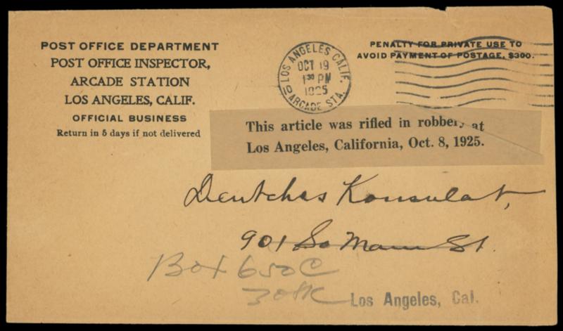 (Robbery) This article was rifled in robbery at Los, Angeles, California, Oct 8, 1925. Manila label on uprated 2¢ red entire with German Consulate corner card addressed to Berlin, Germany, with top portion of cover roughly torn off (rifled), with original Post Office ambulant penalty cover with same label addressed to German Consulate returning the corrupted correspondence, Very Fine and unusual. Estimate; $200 - 300. US$200-300 (Image)