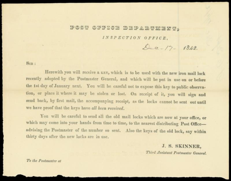 1833-1860s Mail Depredation Letters and P.O. Dept. Circulars. Interesting group of 17 items including letters reporting mail thefts and P.O. Department printed circulars, note 1841 letter to Postmaster General Wickliffe with details concerning overland mail bag security, 1843 letter from P.O.D. Mail Depredation Desk, 1842 Circular advising of postmasters of new mail bag locks, 1848 Circular regarding restrictions on Access to the mails and Depredations producing great loss to the citizens, 1856 robbery report of unregistered letter from Seneca Falls N.Y., etc., most letters with content transcripts, F.-V.F. and wonderful group. Estimate; $500 - 750. View a PDF of images for this lot US$500-750 (Image)