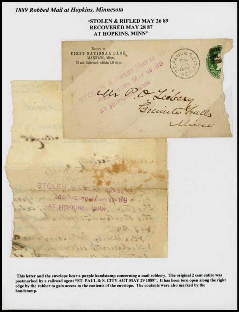 (Robbery) 1889-1987 Mail Robbery Postal History. Group of 8 different mail robberies comprising 1889 robbed at Hopkins Minn, 1903 Oklahoma Territory, 1931 Morris Minn., 1976 theft of mail in Los Angeles, and latter examples with robbery handstamps, 1976 with ambulatory penalty envelope and POD letter; expected faults, F.-V.F. and rare group. Estimate; $500 - 750. View a PDF of images for this lot US$500-750 (Image)