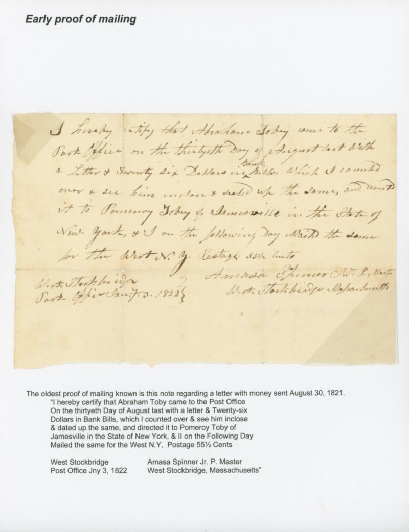 1822 (Jan. 3) West Stockbridge, Mass. Proof of Mailing. One page proof of mailing regarding a letter sent Aug. 30, 1821 reading "I hereby certify that Abraham Toby came to the Post Office on the thirtyeth day of August last with a letter & twenty-six Dollars in Bank Bills, which I counted over & see him inclose & dated the same, and directed it to Pomeroy Toby of Jamesville in the State of New York, & I on the following day mailed the same for West N.Y., Postage 55½ Cents, Amasa Spinner Jr. P. Master, West Stockbridge, Massachusetts } West Stockbridge, Post Office Jny 3, 1822", Very Fine,the earliest proof of mailing recorded. Estimate; $150 - 200. US$150-200 (Image)