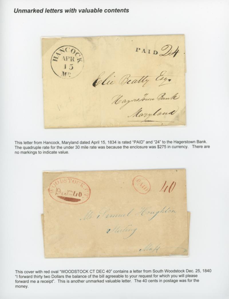 1834-40, Unmarked Letters with Valuable Contents. Group of 4 covers on two exhibit pages comprising 1834 Hancock Md. to Hagerstown Md. quadruple rate with $275 currency enclosed; 1840 Woodstock Ct. oval to Sterling Mass. enclosing $32; 1840 Sacketts Habor N.Y. "Free" to Waddington with $250 enclosed marked "Excess" and "12½" due for additional rate beyond the first ½ ounce allowed to a Postmaster; and 1840 Gambier N.Y. to Detroit Mich. with red "18¾" rating enclosing $12, marked unpaid "37½" cents due, Very Fine group. Estimate; $200 - 300. US$200-300 (Image)