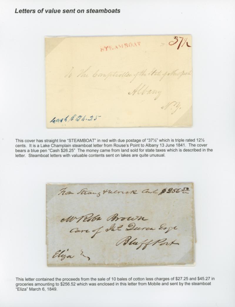 1841, 1849 Letters of Value Sent on Steamboats. Two letters comprising Jun. 13 1841 Rouses Point N.Y. to Albany on Lake Champlain with red "Steamboat" straightline and "37½" rating, blue ms. "Cash $26.25"; second Mar. 6th 1849 Mobile to Bluff Port endorsed per "Eliza" and containing "Cash $256.50" for net proceeds from the sale of 10 bales of cotton, Very Fine pair. Estimate; $150 - 200. US$150-200 (Image)