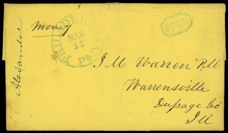 1842 (Mar. 11) Philadelphia Pa. "Money". Manuscript endorsement on yellow cover with partial blue "Philadelphia Pa. Mar 11" cds with matching "Free" octagon handstamp to Warrensville Ill., Very Fine and early money letter. Estimate; $150 - 200. US$150-200 (Image)