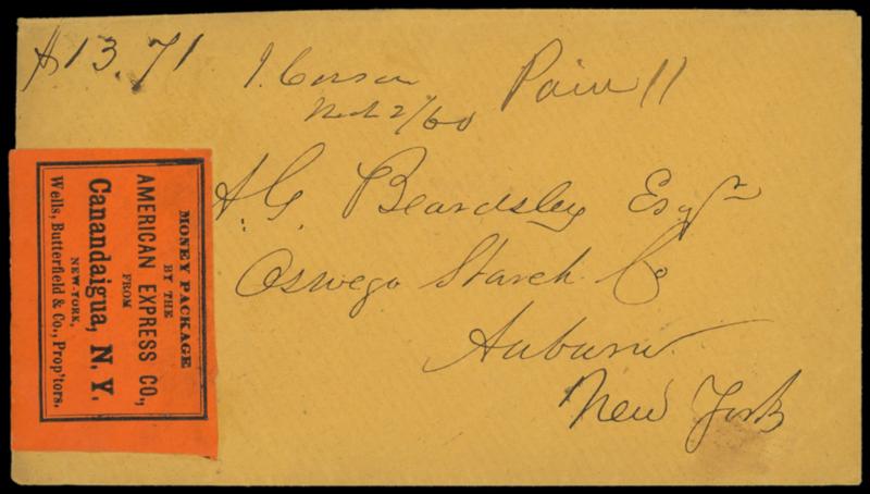 1860 (Mar. 2) Canandaigua N.Y. to Auburn N.Y. via American Express. Orange cover endorsed "$13.71" enclosed and "Paid 11", black on orange "Money Package by the American Express Co., from Canandaigua, N.Y. Wells, Butterfield & Co. Prop'tors" express label, flap with red "New York and Erie R.R. Co. Express, Canandaigue" wax seal, Very Fine. Estimate; $100 - 150. US$100-150 (Image)