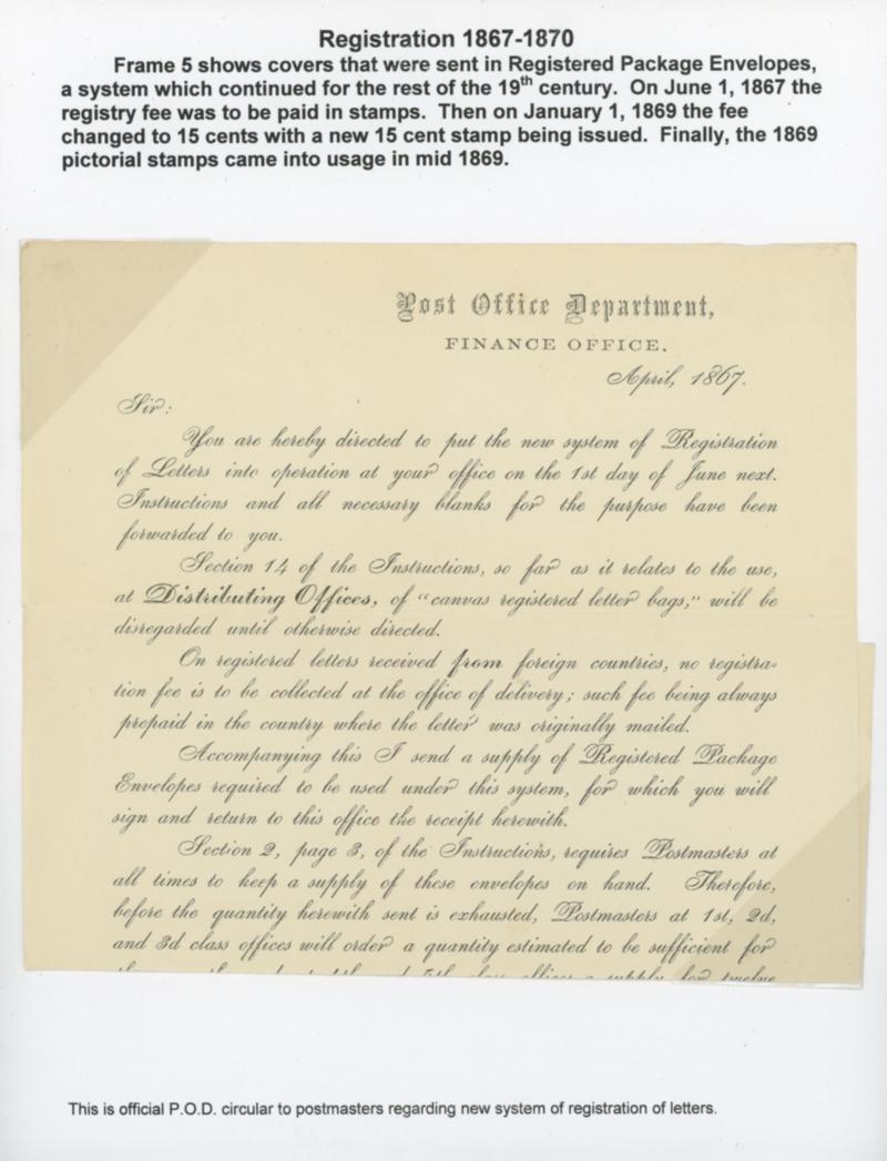 1867 (Apr.) Registered Package Envelopes. Lot comprising one-page printed "Post Office Department, Finance Office, April 1867" circular to postmasters regarding the new system of the registration of letters in which covers will now be securely sent in registered package envelopes, and 1868 Portland Me. legal-size registered package envelope to Green's Landing Me., Very Fine. Estimate; $200 - 300. US$200-300 (Image)