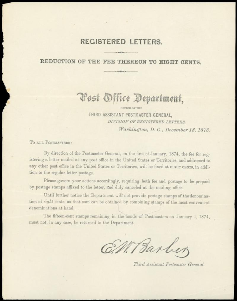 1873 (Dec. 18) Post Office Announcement of 8¢ Registry Fee. One-page printed announcement titled "Registered Letters, Reduction of the Fee thereon to Eight Cents" for any letter mailed domestically effective January 1, 1874; internal tear and nibbled at left, F.-V.F. Estimate; $300 - 400. US$300-400 (Image)