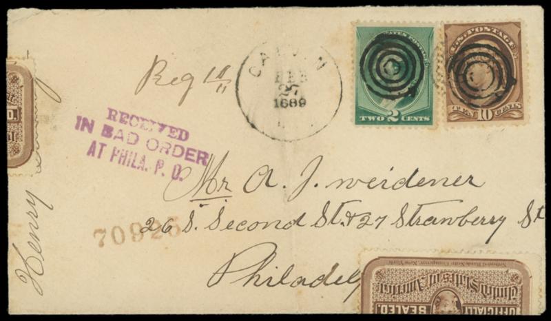 1889 (Feb. 27) to Philadelphia, Pa. Buff cover bearing 2¢ green (213) and 10¢ brown (209), tied by four-ring targets duplexed with indistinct Feb. 27 cds, ms. "Reg 10" registry number, purple "Received, In Bad Order, at Phila. P.O." three-line handstamp and matching Philadelphia Feb. 27th flap seal handstamp, two 1881 Official Seals (OX2) affixed to seal left and bottom edges; central vertical crease, otherwise Very Fine and scarce registered officially sealed use. Estimate; $150 - 200. US$150-200 (Image)
