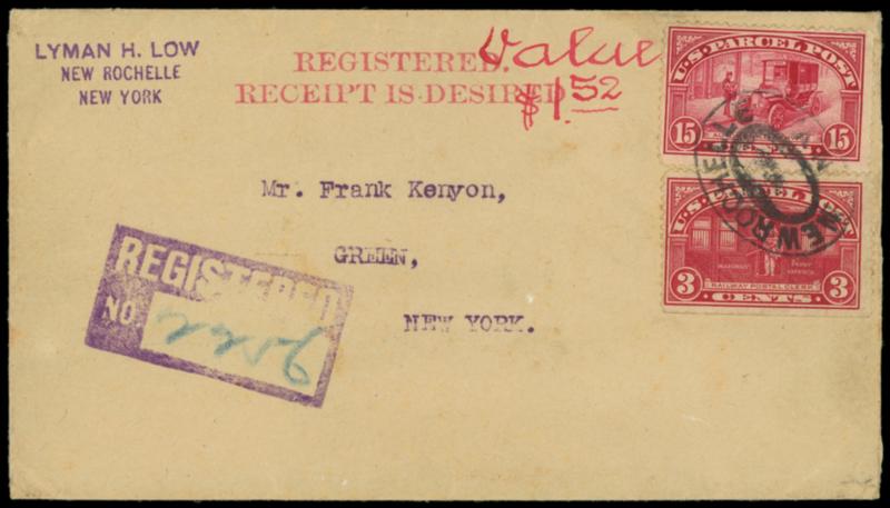 1913 (Sep. 19) New Rochelle, N.Y. to Green, N.Y. Stiff manila mailing envelope bearing 3¢ Parcel Post (Q3) and 15¢ Parcel Post (Q7), tied together by "New Rochelle N.Y." double-oval, purple "New Rochelle. N.Y. Registered. Sep 19, 1913" backstamps, red "Registered., Receipt is Desired" two-line handstamp, red ms. "Value $1.52", Very Fine and scarce registered use. Estimate; $200 - 300.
