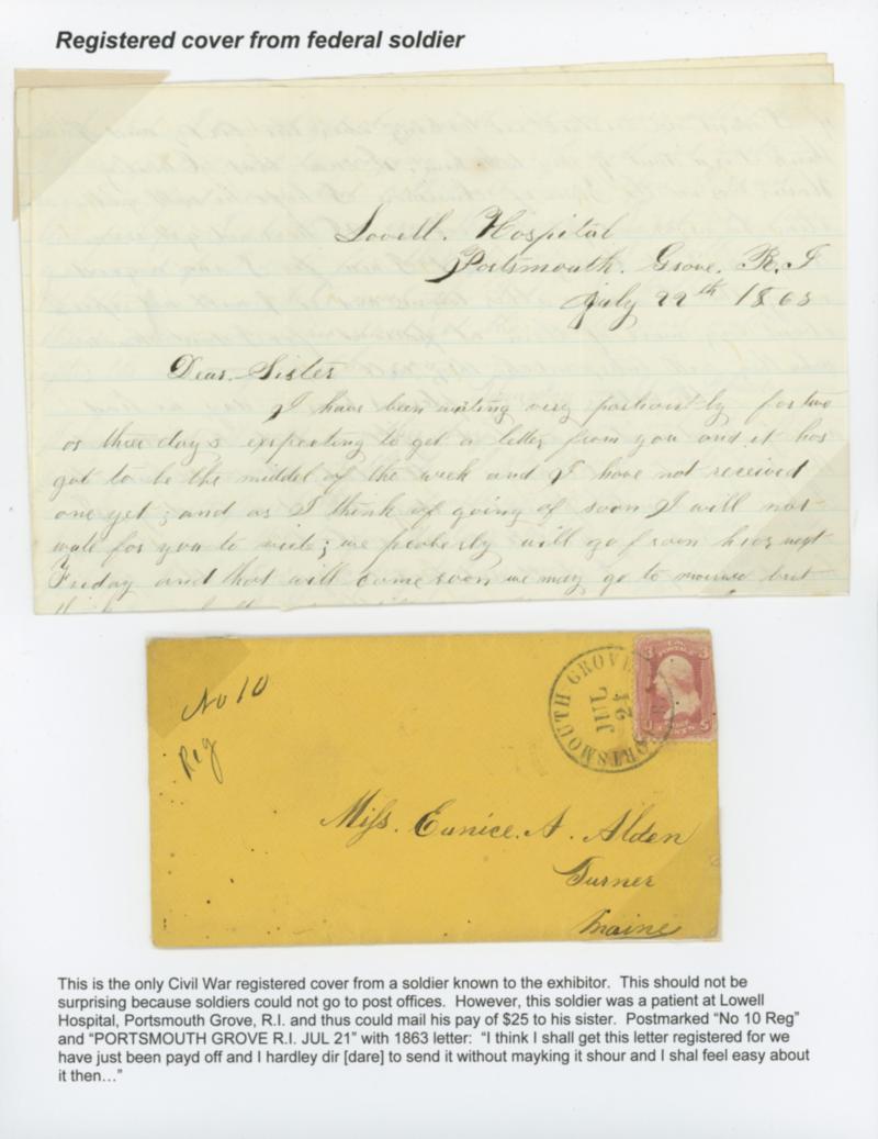 1863 (Jul. 22) Registered from Federal Soldier. Orange cover bearing 3¢ rose (65) tied by "Portsmouth Grove R.I. Jul 24" cds, ms. "Reg, No 10" registry marking to Turner Me., original enclosed letter datelined "Lowell Hospital, Portsmouth Grove, R.I., Jul 22d 1863" reading "…I think I shall get this letter registered for we have just been payd off and I hardley dir [dare] to send it without mayking it shour and I shal feel easy about it then…"; cover reduced at right into 3¢, F.-V.F. Estimate; $200 - 300.