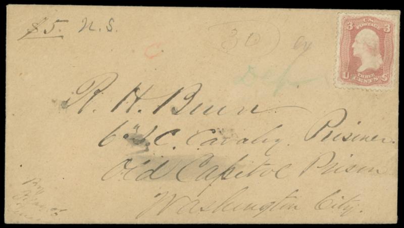 (Prisoner of War) Old Capital Prison, Washington D.C. Buff cover bearing addressed to R.H. Burn, 6th S.C. Cavalry Prisoner, Old Capitol Prison, endorsed "By Flag of Truce" at bottom left and "$5 U.S." at top left, some red and green notations plus pencil "Ex" examiner's marking, Very Fine and rare registered use to Confederate POW. Estimate; $500 - 750.