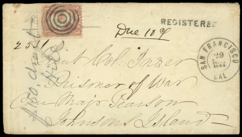(Prisoner of War) Johnsons Island, Sandusky, O. Incoming cover addressed to "Lieut Col. Inser, Prisoner of War, Care Major Pearson, Johnsons Island", bearing 3¢ rose (65), nat. s.e., canceled by target, matching "San Francisco, Cal. Mar 29, 1864" cds and straight line "Registered" handstamp, manuscript "Due 10¢" and matching "2531" registry number tying stamp, endorsed "$150 draft, Hill" in pencil at left additionally tying stamp; 3¢ corner crease, Very Fine,ex-Polland. Estimate; $500 - 750.