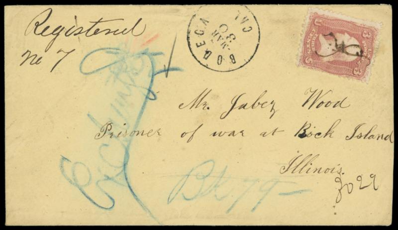 (Prisoner of War) Rock Island, Illinois. Incoming buff cover addressed to "Mr. Jabez Wood, Prisoner of War at Rock Island, Illinois", bearing pen canceled 3¢ rose (65) and "Bodega Cal. Mar 30" cds, blue crayon "Examined" and "Box 79" notations; reduced slightly at right, small 3¢ flaws, F.-V.F. and scarce registered cover to Civil War POW. Estimate; $400 - 600. US$400-600 (Image)