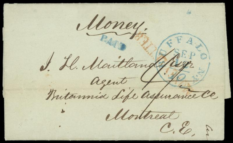Buffalo N.Y. "Money". Blue folded letter with sender's ms. "Money" endorsement, entered mails with blue "Buffalo N.Y. '10' Sep 12" intregral-rate cds and "Paid" handstamp, red Montreal (9.15) arrival backstamp and matching "Money Letter" straightline with "4½" pence due rating, Very Fine cross-border money letter. Estimate; $150 - 200. US$150-200 (Image)