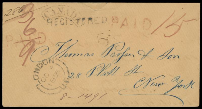 1856 (Oct. 4) London, Canada to New York N.Y. Orange buff cover with "London, U.C., OC 4, 1856" cds and "Registered" straightline with ms. 286" number, red "Paid" h.s. with red ms. "3 6 / 9" rating for 3 pence registration fee and 6 pence postage, additional red "Paid" h.s. with red ms. "15" cent equivalency, New York framed "Canada" arc handstamp and magenta "8-1491" number; no flap, small top edge mend, Very Fine. Estimate; $500 - 750.