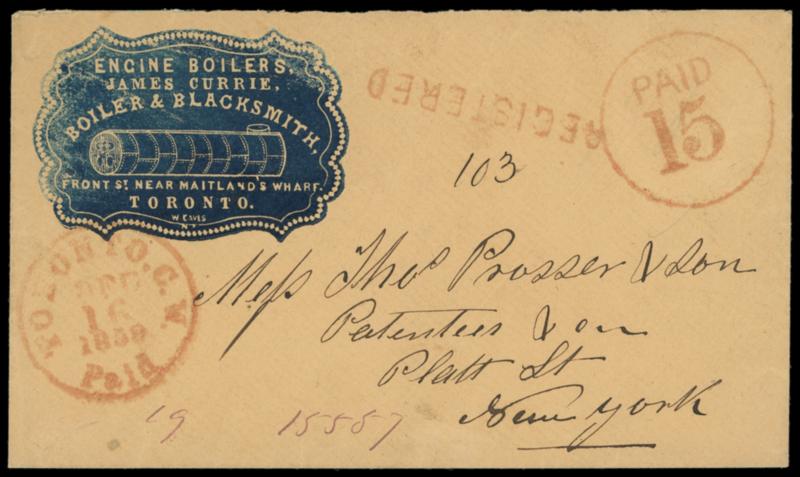 1859 (Dec. 16) Toronto, Canada to New York N.Y. Buff cover with blue illustrated "Engine Boilers, James Currie, Boiler & Blacksmith" Eaves cameo corner card showing engine boiler, showing red "Toronto C.W. 'Paid' Dec 16, 1859" cds with matching "Paid 15" in large circle and "REGISTERED" straightline with ms. "103" number, New York magenta "19" and "15557" registry numbers, registry receipt remnant on flap; neatly opened at top, Very Fine and handsome cross border use. Estimate; $400 - 600. US$400-600 (Image)