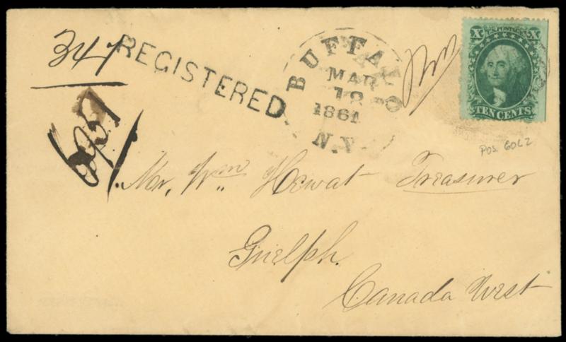 1861 (Mar. 18) Buffalo N.Y. to Guelph, Canada. Buff envelope bearing 10¢ green (35) straddline s.e., pos. 60L2, tied by circular grid cancel, matching "Buffalo N.Y. Mar 18, 1861" cds and ms. "341" registry number, Hamilton (3.19) entry cds backstamp with matching "Registered" straightline and ms. "6951" number, Guelph (3.19) arrival backstamp; light horizontal fold, Very Fine. Estimate; $300 - 400.