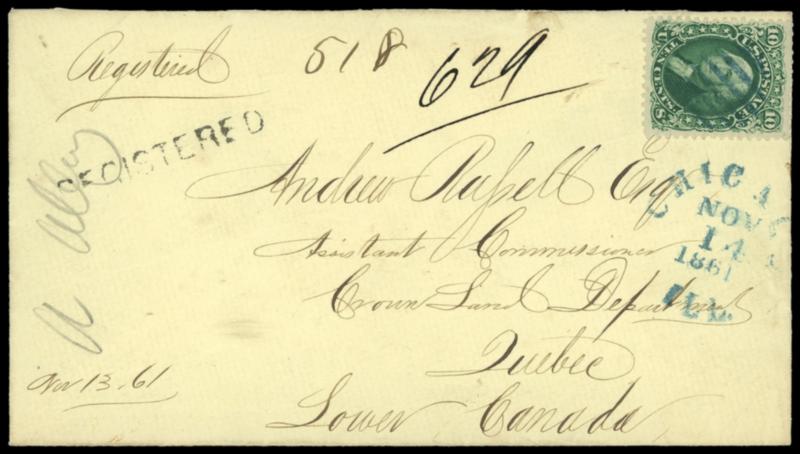 This cover was sent from London, Upper Canada on October 4, 1856 only 4 days after the registration treaty went into effect and is the earliest known registered letter sent under the U.S.-Canada convention. We know it was registered in New York since there is a magenta New York destination manuscript marking below the address. US$500-750 (Image)
