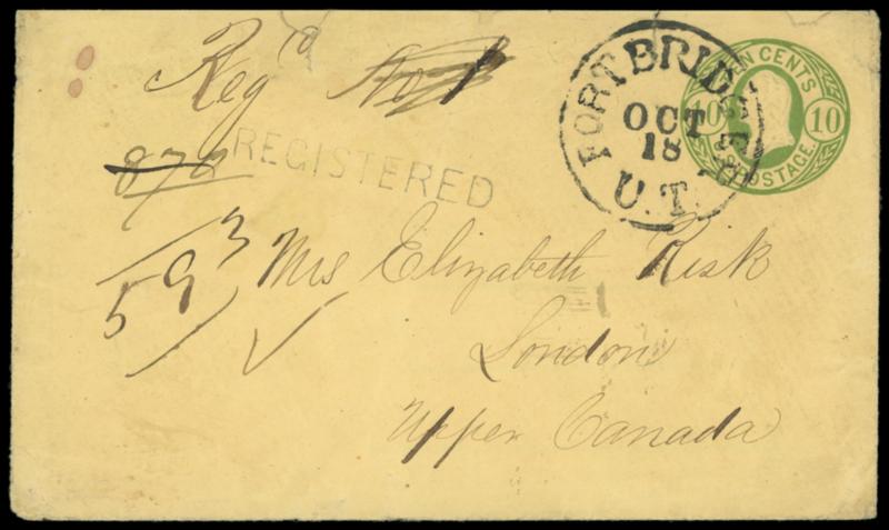 1862 (Oct. 18) Fort Bridger, Utah Territory to London, Upper Canada. 10¢ yellow green (U41) buff entire canceled by "Fort Bridger U.T. Oct 18" cds with ms. "No 1" registry number, Windsor (11.4.1862) double-arc backstamp with matching "Registered" straightline and ms. "870" number, London (11.5) arrival backstamp and ms. "593" registry number; small edge tears and wear, couple small stain spots, otherwise Very Fine and rare Utah Territory registered cross-border use. Estimate; $500 - 750.
