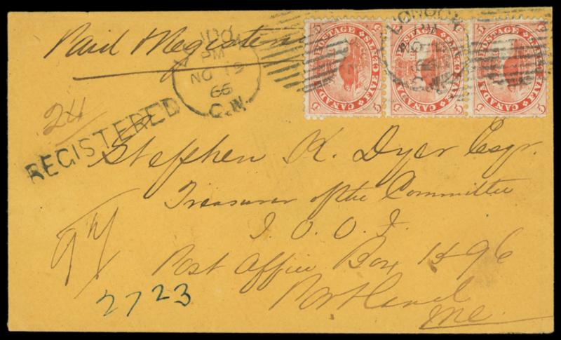 1866 (Nov. 19) London, Canada West to Portland Me. Orange cover bearing Canada 5¢ vermilion (15) vertical strip of three, tied by grid cancels duplexed with "London C.W. NO 19 '66" cds, matching "REGISTERED" straightline and ms. "24" registry number, Montreal (11.21) transit backstamp, blue ms. "2723" number; minor cover wrinkling at top, reduced slightly at right, Very Fine. Estimate; $200 - 300. US$200-300 (Image)