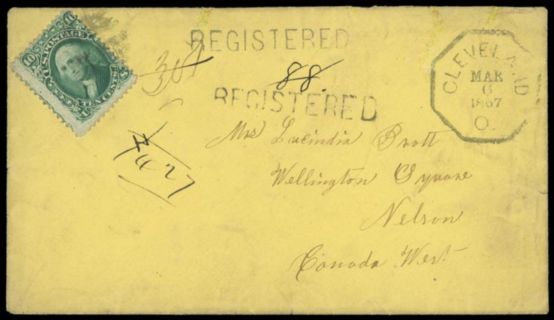 1867 (Mar. 6) Cleveland, Ohio to Wellington Square, Canada West. Yellow cover bearing 10¢ green (68) tied by circular grid, matching "Cleveland O. Mar 6, 1867" octagon datestamp with ms. "88" registry number, Hamilton (3.7) backstamp and two matching "REGISTERED" straightline strikes with ms. "307", blue Wellington (3.8) arrival backstamp and ms. "427" registry number, top edge tears, Fine appearance. Estimate; $200 - 300.